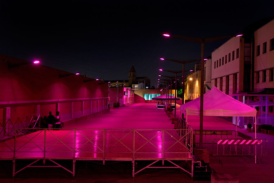 I lampioni sono stati ricoperti con filtri colorati in modo che l’intera piazza, attraverso la luce, assuma una tonalità di colore viola.