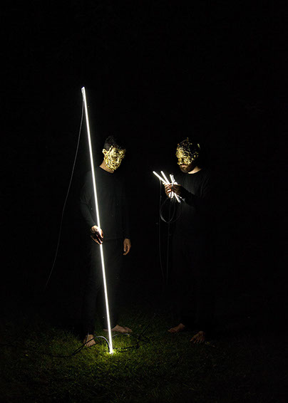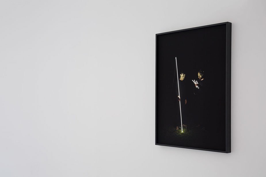 Paesaggio con Ferula è un’immagine costruita da due personaggi che si appropriano della scultura al neon (Ferula) nel tentativo di fissare una scena. Un lavoro corale in cui la composizione della performance ha lasciato spazio alla contaminazione di altri linguaggi apparentemente distanti tra loro. Il rigore formale della ricerca scultorea (Bomben) viene decostruito e ridimensionato per una performance finalizzata alla fotografia (Tajariol), il cui risultato (forse) è una icona.