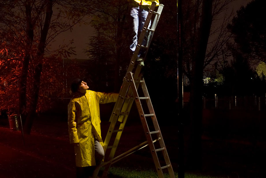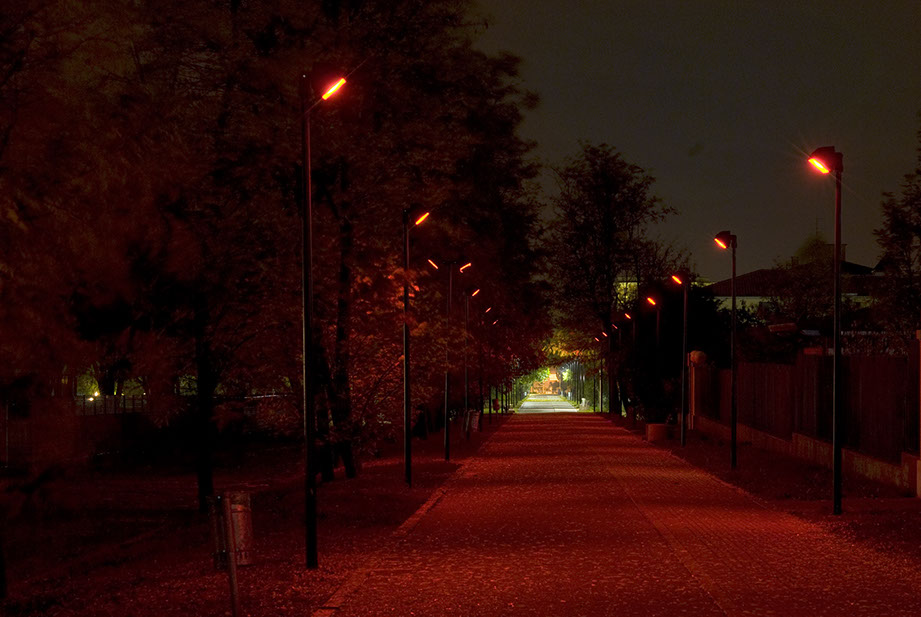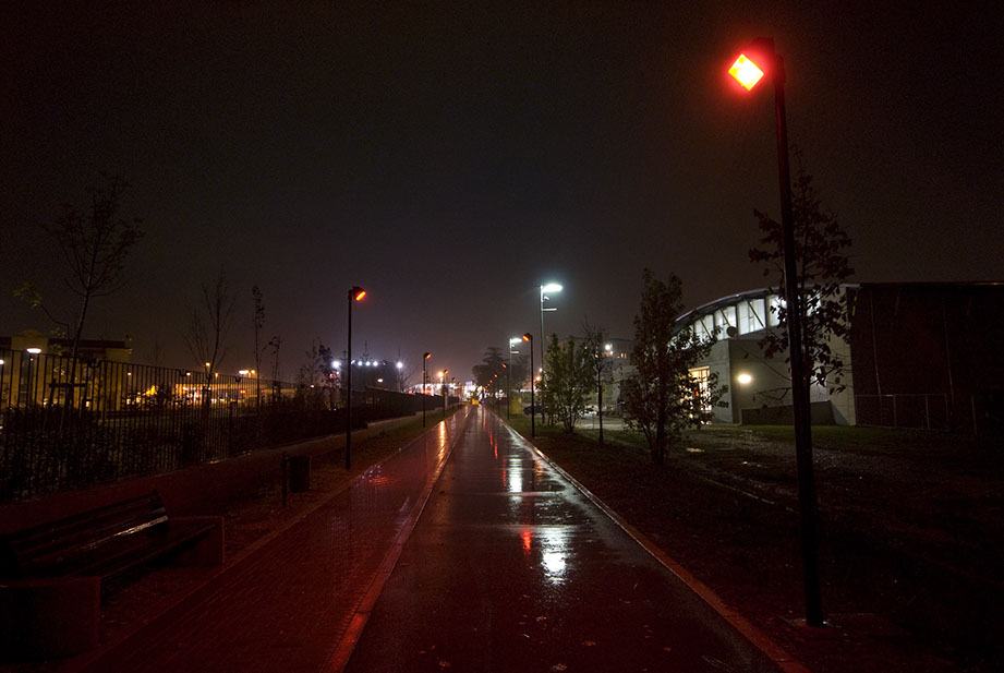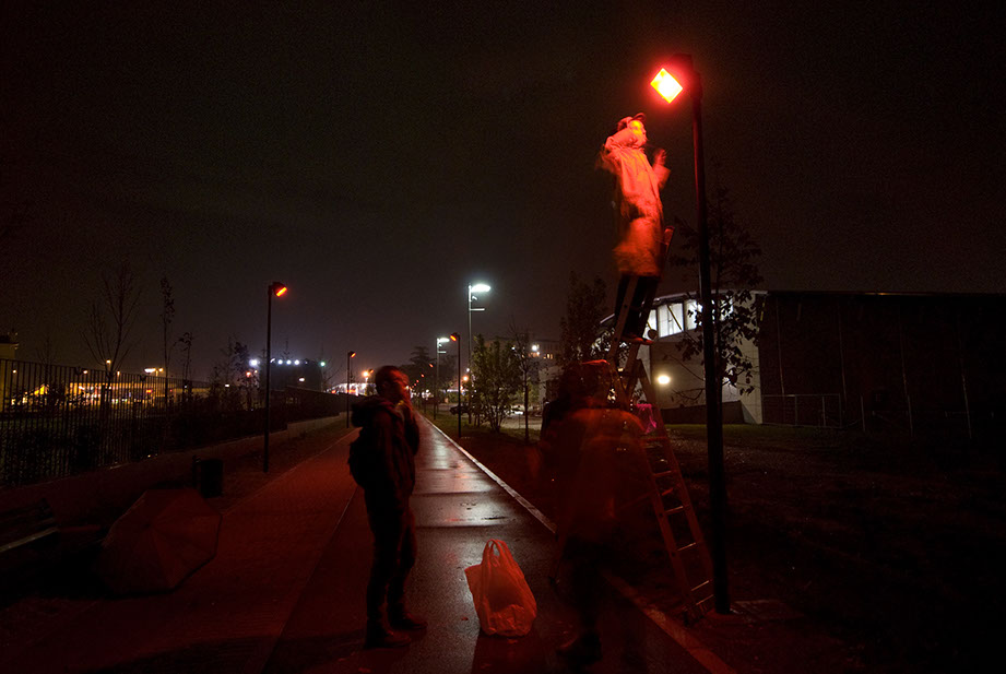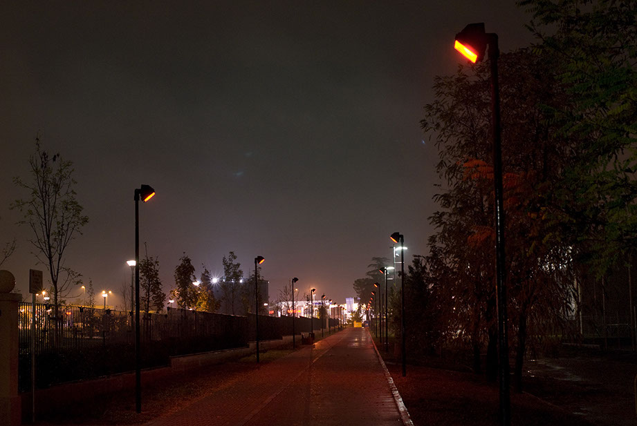e abbastanza ravvicinate (luci ad incandescenza e fluorescenza che producono gamme cromatiche totalmente differenti). Il primo pezzo del percorso consente una migliore percezione del colore usato per virare la luce, diventando spazio intimo e suggestivo, il secondo entra in relazione con l’illuminazione pubblica “normale” creando una sorta di osservatorio che permette di confrontare le diverse situazioni luminose in lontananza.