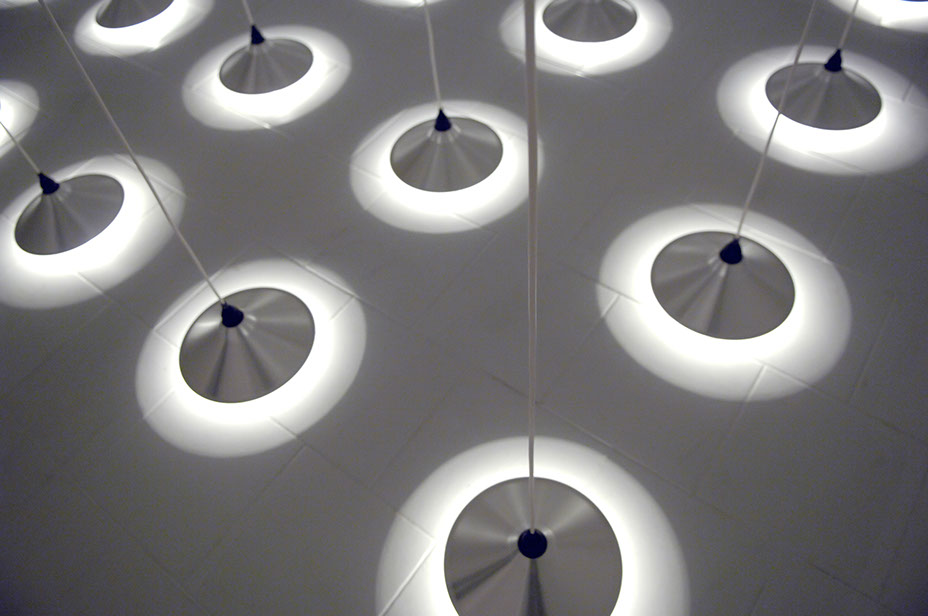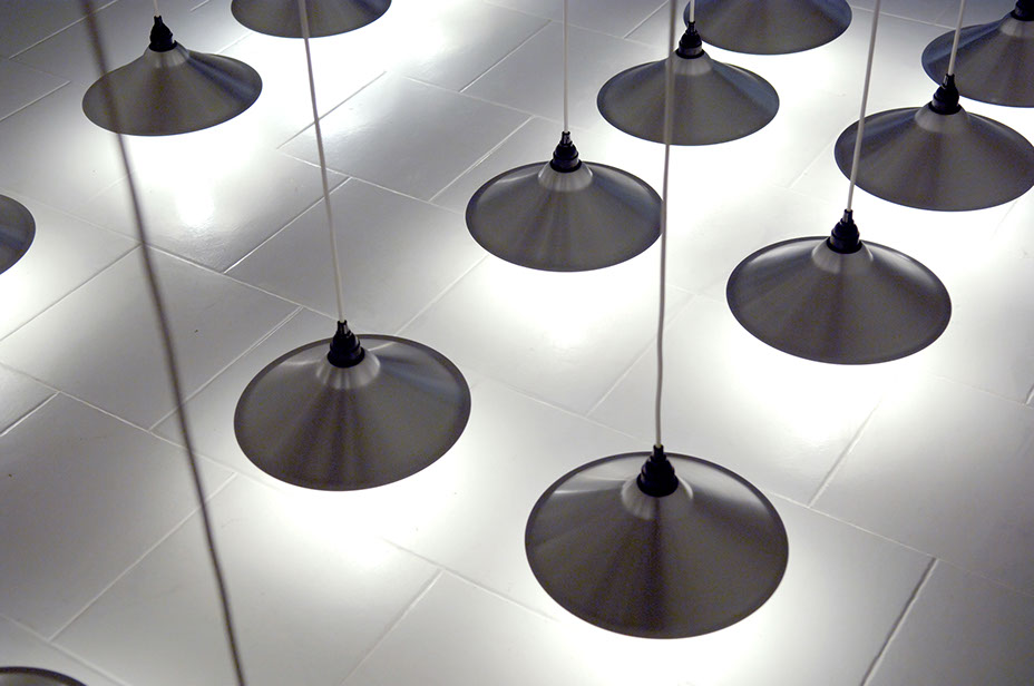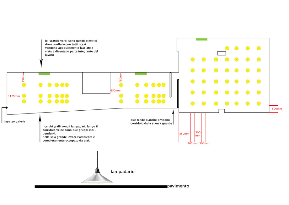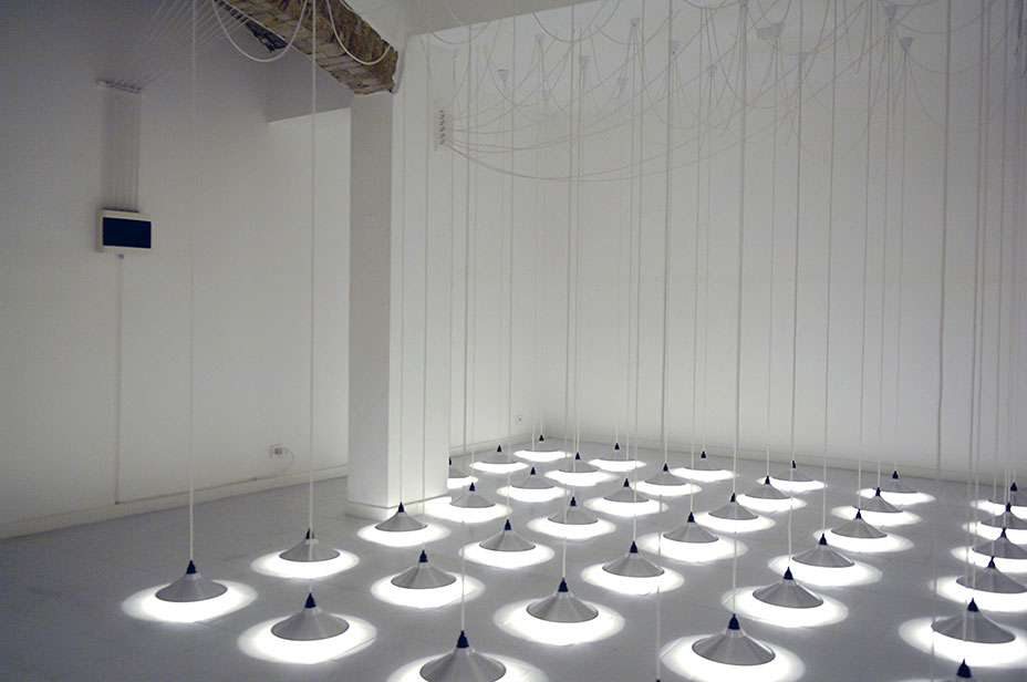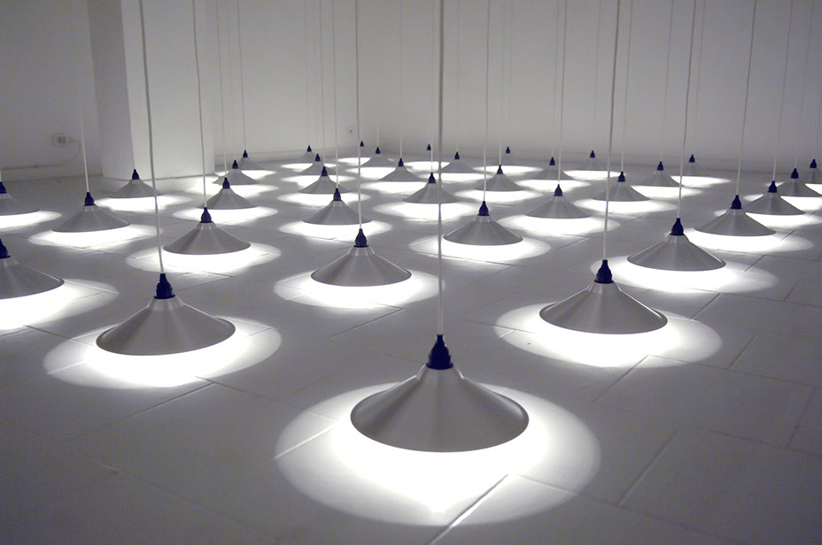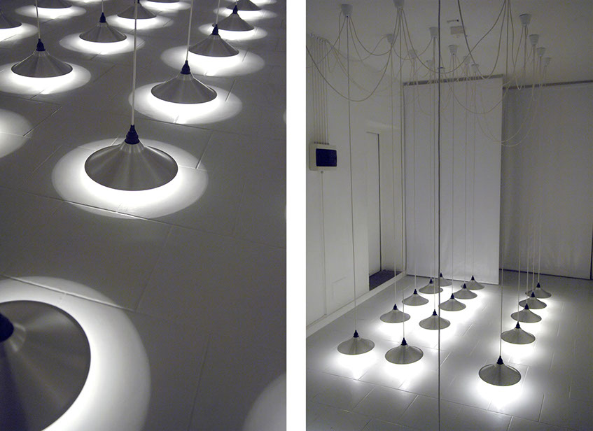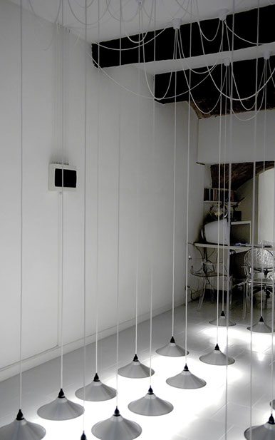 le distanze e permette di arrivare subito al punto: guardare le cose con occhi diversi, sintetizzare visivamente un pensiero con umili utensili domestici, rendere inutile un oggetto usuale come il lampadario, portando la sua luce quasi a livello del pavimento. È un’operazione dall’incisiva semplicità, d’altri tempi. Non c’è dispersione d’idee e concetti, l’attenzione finalmente può concentrarsi perché il corpo dell’opera è ridotto all’osso: uno scheletro di cavi elettrici bianchi s’irradiano partendo da tre quadri-centraline, giungendo al soffitto, per poi ricadere diritti e finire nei 75 lampadari puntati a terra. Qui contano