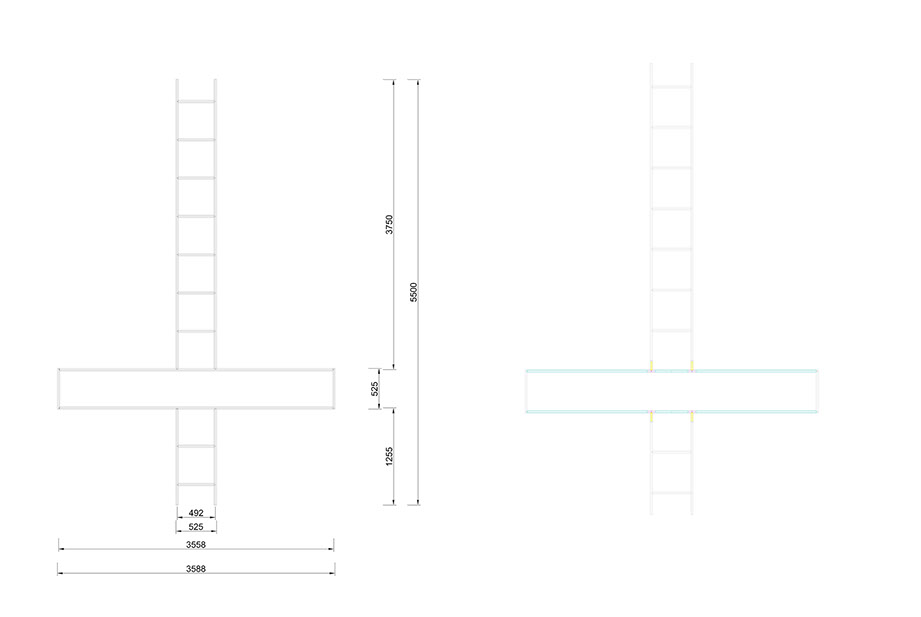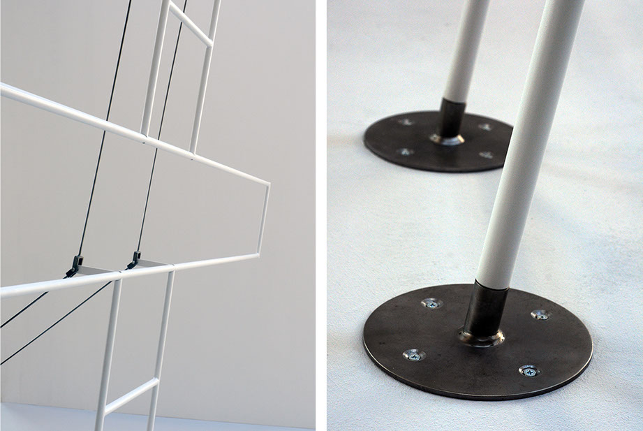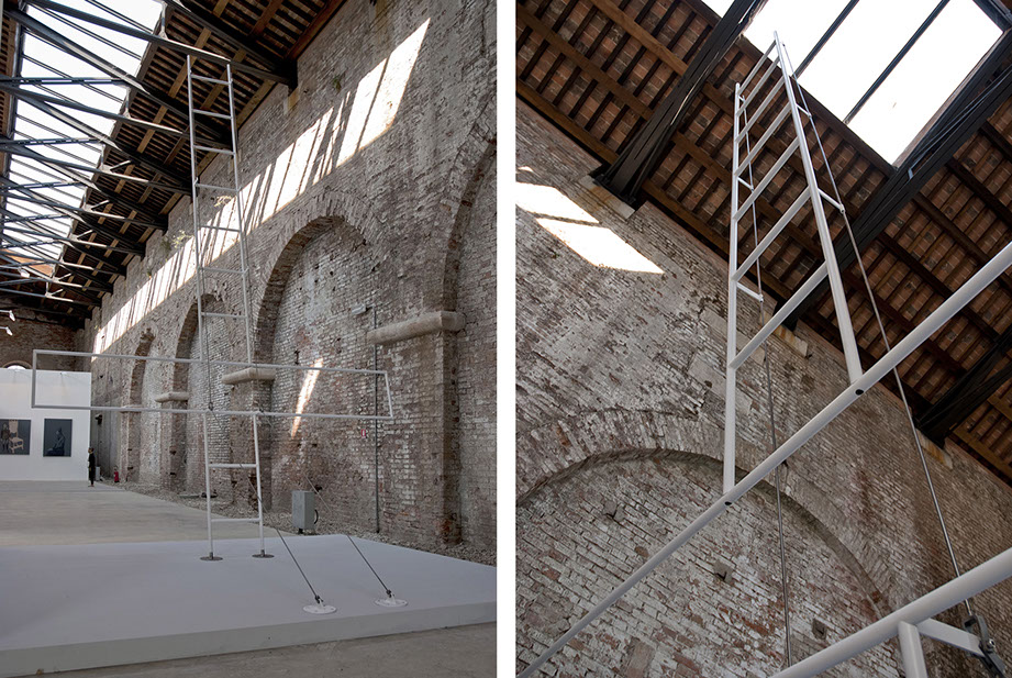 In questo caso però il simbolo viene trasformato in una scala, che sale verso il cielo alludendo ad un ascesa, o meglio alla possibilità della risalita, diventando una sorta di paradosso. Due elementi, concettualmente così lontani, uno modesto strumento di lavoro e l’altro simbolo carico di significati spirituali, diventano insieme senso nuovo e pongono una domanda: quali sono le strade, quanto noi stessi possiamo costruirle e quanto sono valide quelle che ci hanno date per vere.