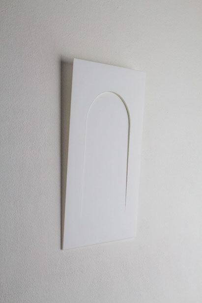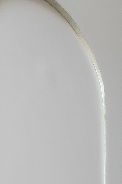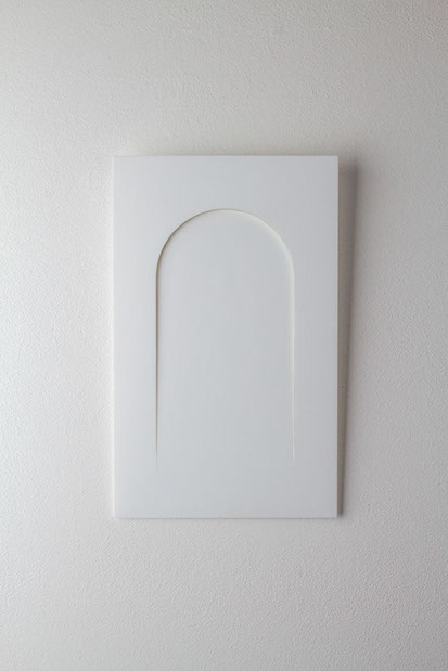 In Incavo senza titolo la superficie dell’opera, composta da una lastra di corian bianco, si ritrae di pochi millimetri generando un piccolo bassorilievo. La luce disegna l’opera, con minimi segni, ed esalta la decorazione in foglia oro bianco, realizzata solo nello spessore dell’incavo.