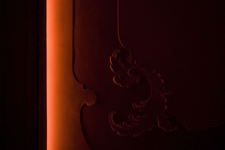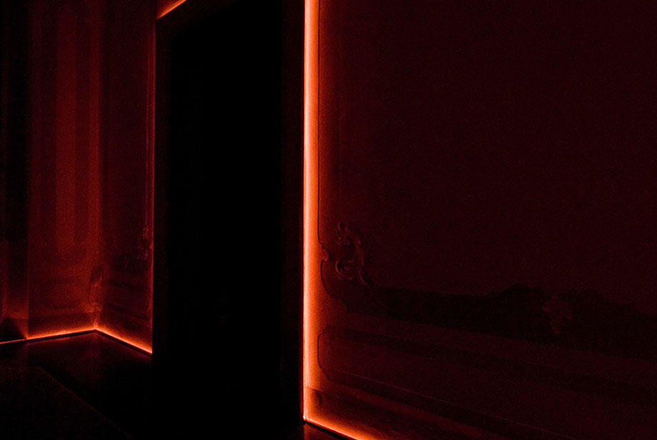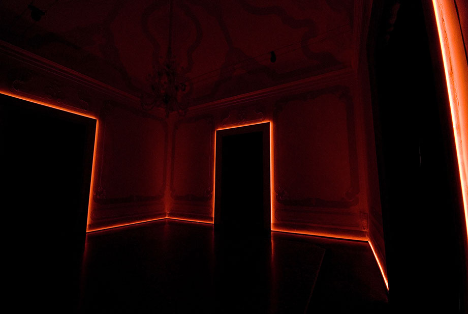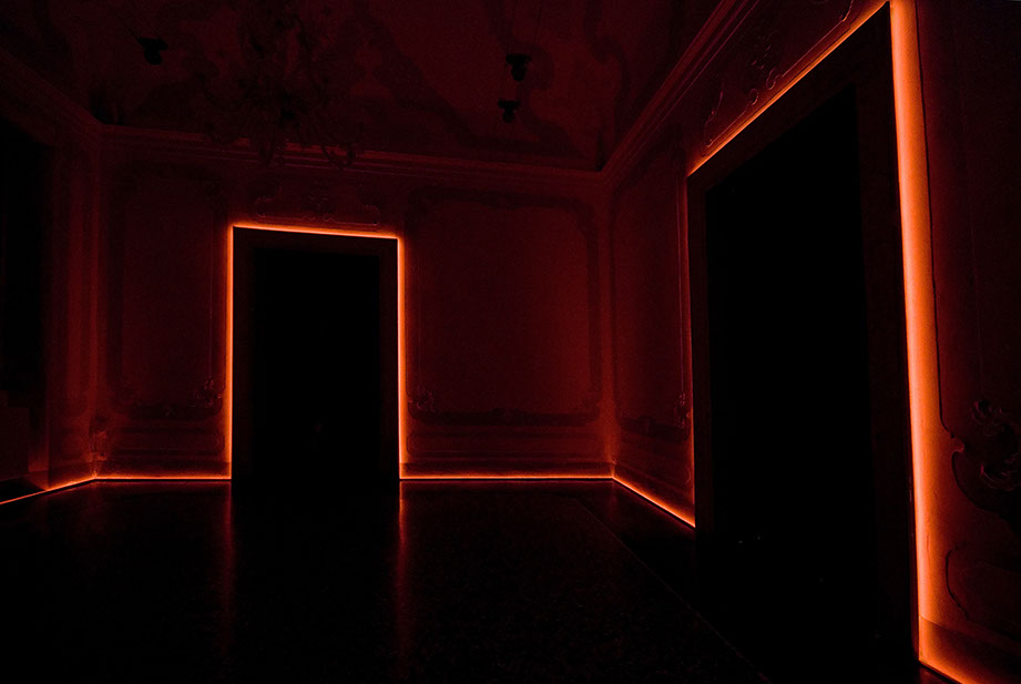 La luce emessa dalla linea luminosa (neon strip) è rivolta verso l’alto e fa percepire il suolo completamente buio.
