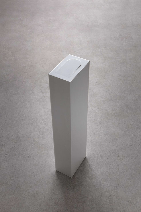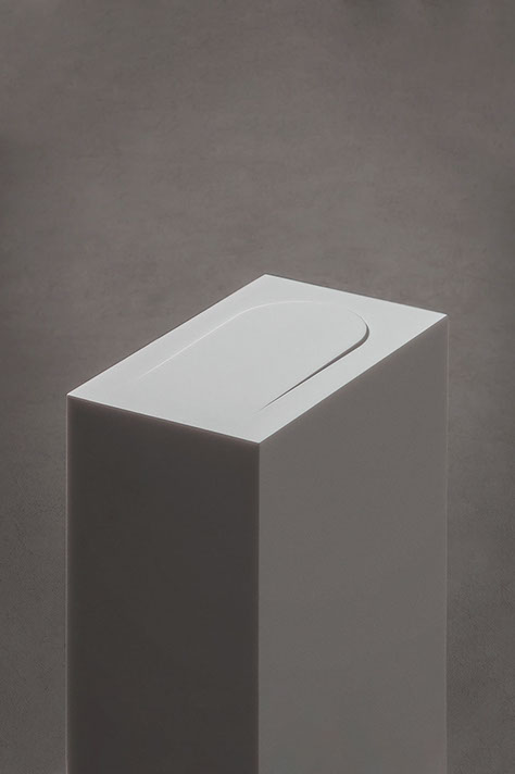 VOLUME SENZA TITOLO 2010, Hanex, 105 x 18 x 25 cm Ph Marco Diodà Questa scultura è un monolito bianco. Quando la vedi, se la guardi velocemente può sembrare un semplice piedistallo. Ma quando vai verso di lei ti accorgi che sulla superficie superiore emerge un leggero segno. Mi piace pensare che la materia voglia mostrarsi, come se avesse una sua volontà. Nel lavoro c’è un unico materiale e ci sono due semplice segni. Nella parte inferiore la base è leggermente rastremata e questo da grande slancio e leggerezza al volume che altrimenti sembrerebbe pesante; e poi il segno superiore che da senso a tutto. Questo lavoro forse vuole farci pensare a come la presenza della vita o di dio è in tutte le cose.. Dentro alla materia. INCAVO SENZA TITOLO 2019, corian, oro bianco, 18 x 29,5 x 2 cm Incavo senza titolo è parte di un processo di ricerca che prende avvio dalla volontà di rappresentare le dimensioni enigmatiche del sacro. In questo ampio progetto ho cercato di fondere la tradizione di opere d’arte sacra con il contemporaneo, unendo tra loro materiali e tecniche di epoche passate con processi produttivi ed elementi formali contemporanei. Ho deciso di eliminare la parte narrativa per concentrare la massima attenzione sulla relazione tra forma - concetto - materiale. In Incavo senza titolo la superficie dell’opera, composta da una lastra di corian bianco, si ritrae di pochi millimetri generando un piccolo bassorilievo. La luce disegna l’opera, con minimi segni, ed esalta la decorazione in foglia oro bianco, realizzata solo nello spessore dell’incavo. La materia si mostra. Con grande semplicità ci svela il suo interno d’oro, la sua preziosità, la sua natura divina. Gli elementi sono pochissimi, la volontà è di concentrare tutta l’attenzione in pochi millimetri, giocando volutamente sulla potenza del bassorilievo. In quel piccolissimo lembo di materia, decorato in oro, si apre il grande tema della soglia, tipico dell’arte ortodossa, che ci porta in un territorio sospeso, nel quale potremmo trovare la chiave per accedere ai corpi celesti. Come molte altre mie opere, Incavo senza titolo presenta un gioco tra forme curvilinee ed acute ed è soggetto al cambiamento continuo se illuminato con luce naturale.3
